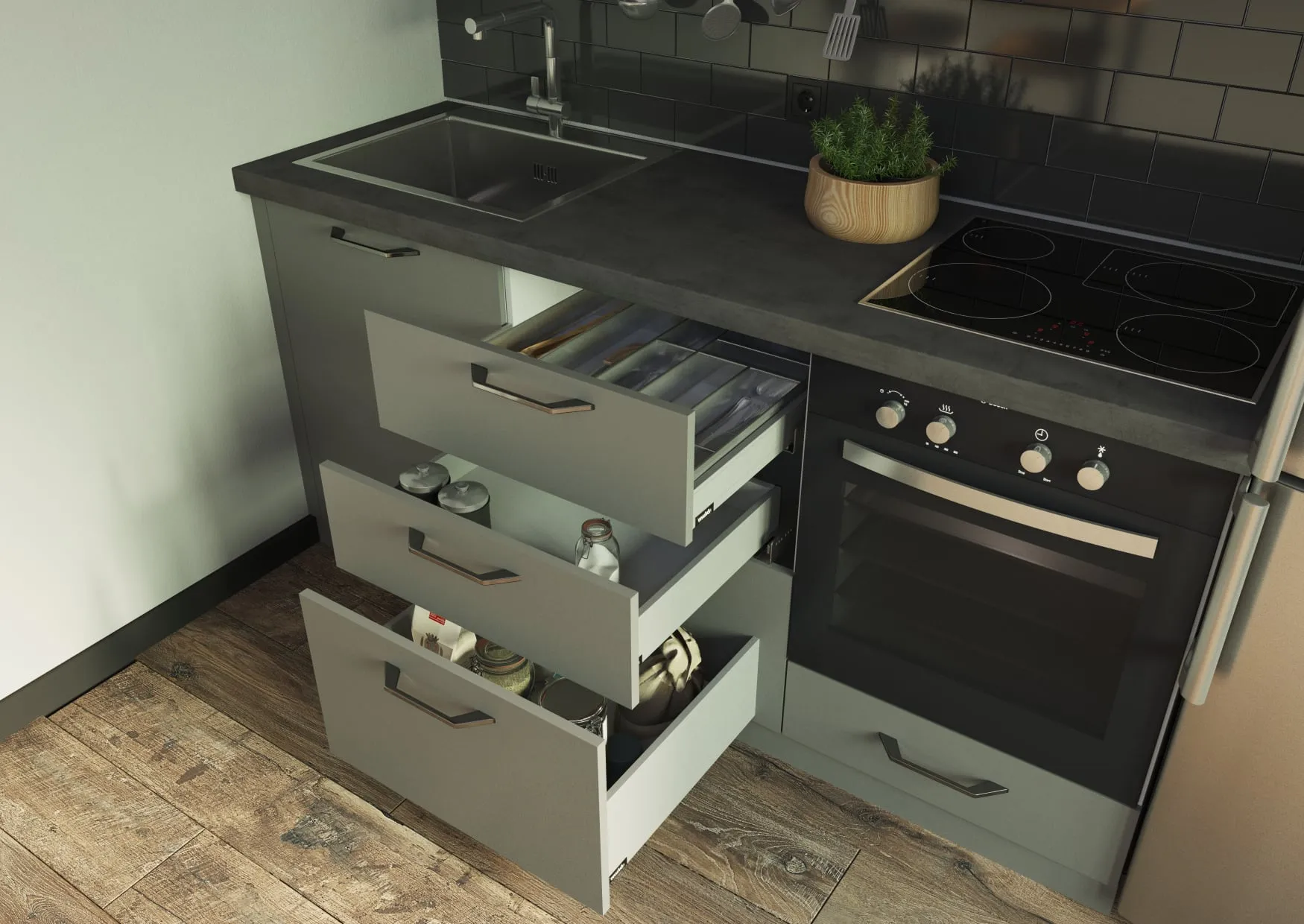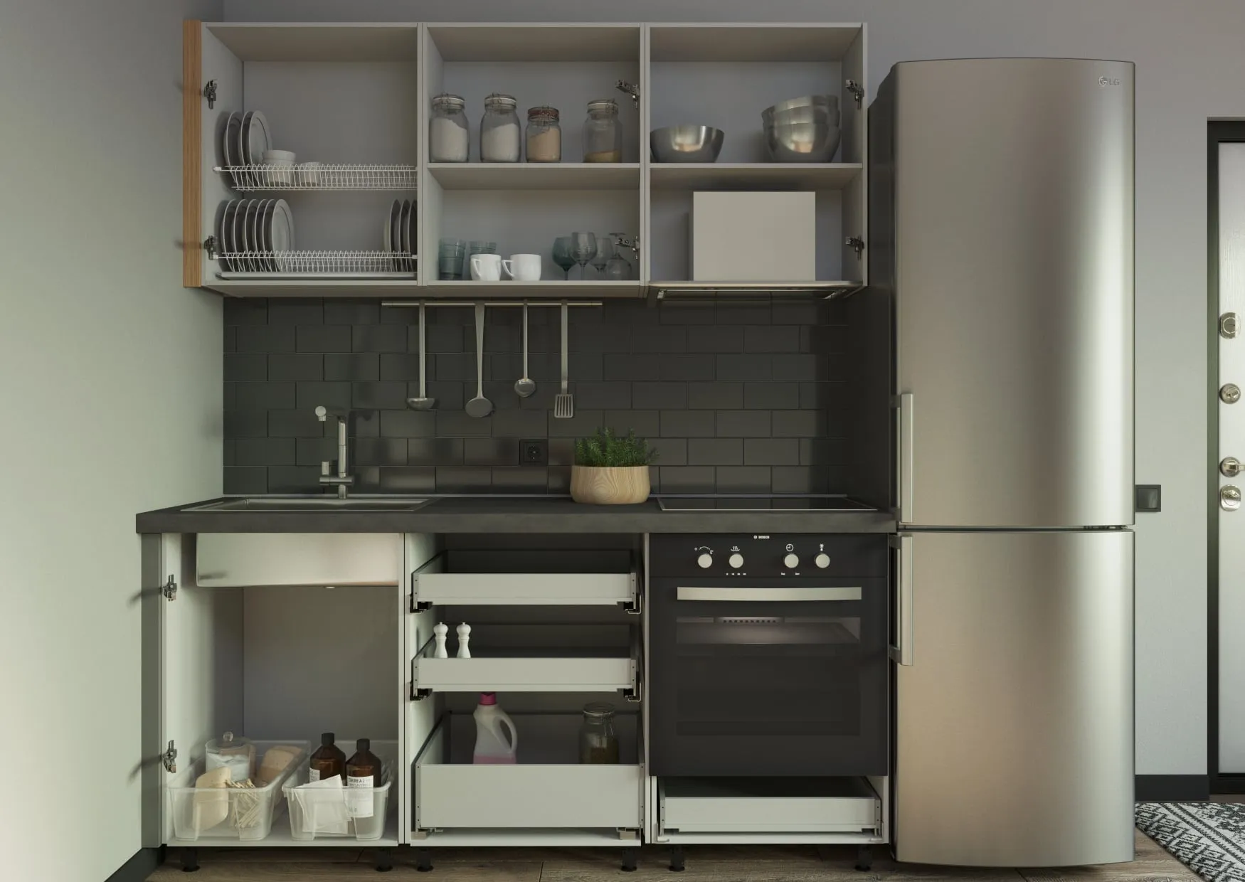 Механизмы открывания: петли Intermat (Hettich), направляющие Quadro 25 (Hettich)