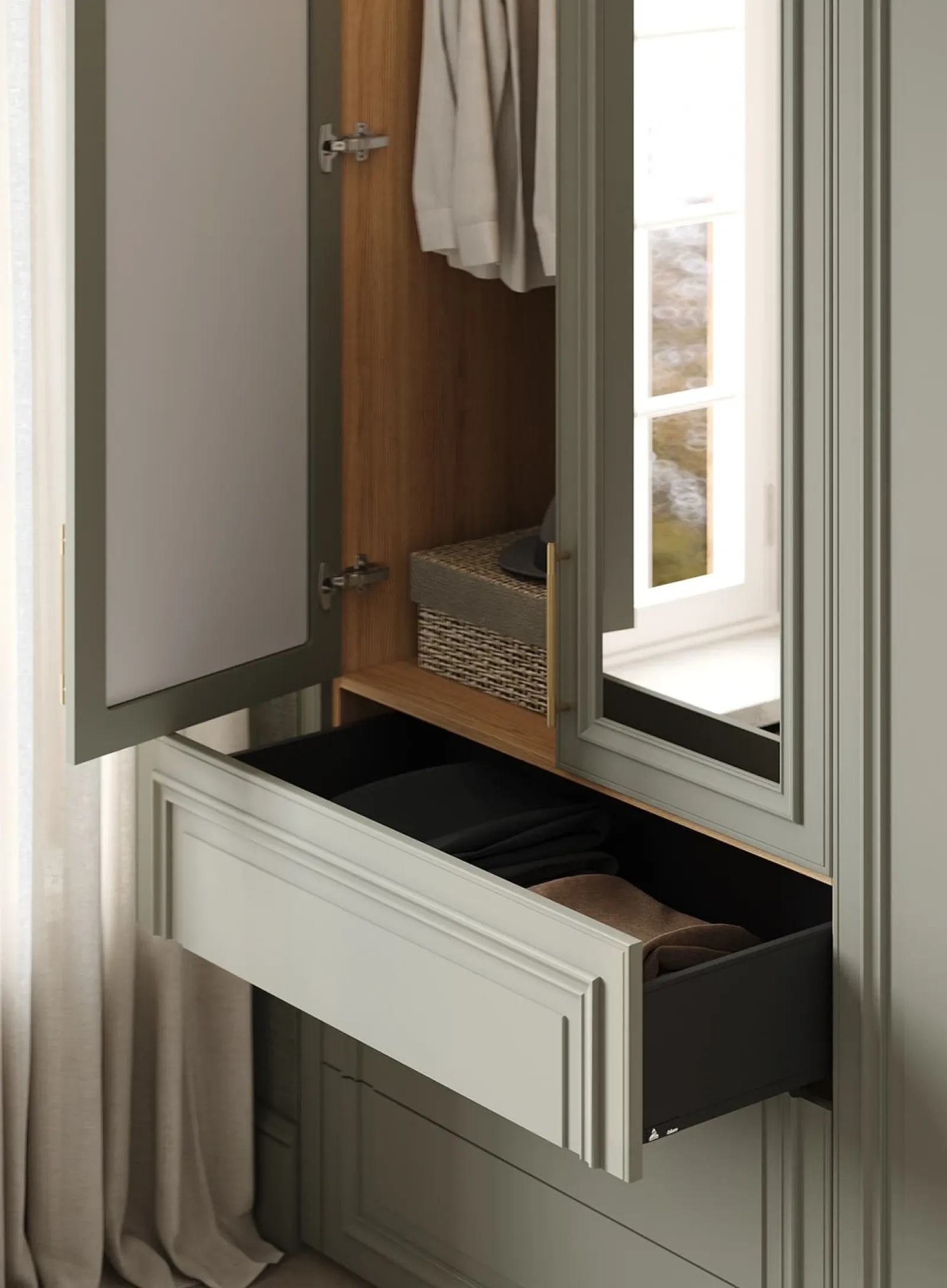 КАРКАС, ПОЛКИ, ВЫДВИЖНЫЕ ЯЩИКИ, ЗАДНЯЯ СТЕНКА ЛДСП, декор Дуб Медовый / крашеная МДФ, цвет NCS S 3005-G20Y Матовый ФАСАДЫ Т654 Крашеная МДФ, цвет NCS S 3005- G20Y Матовый