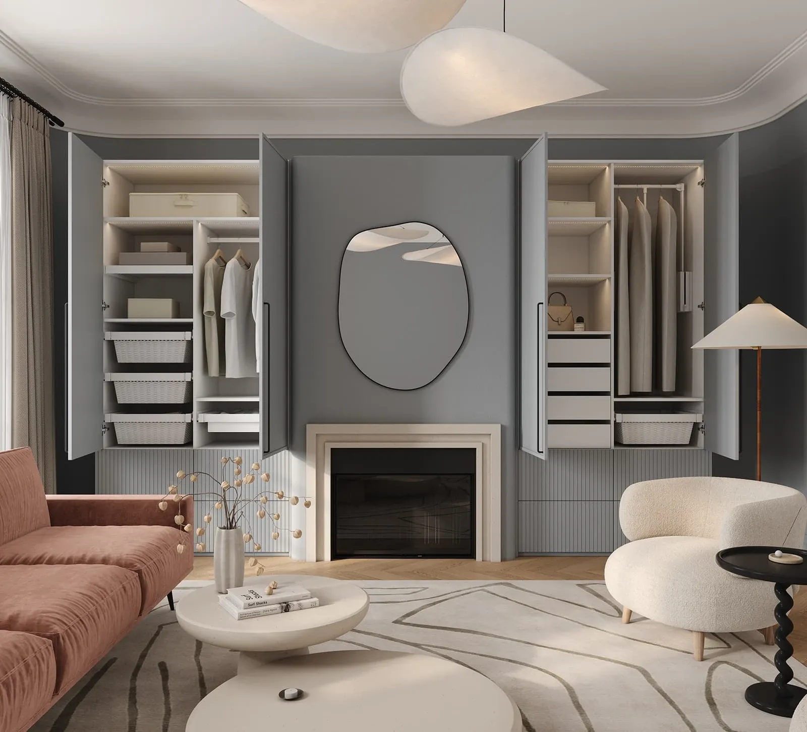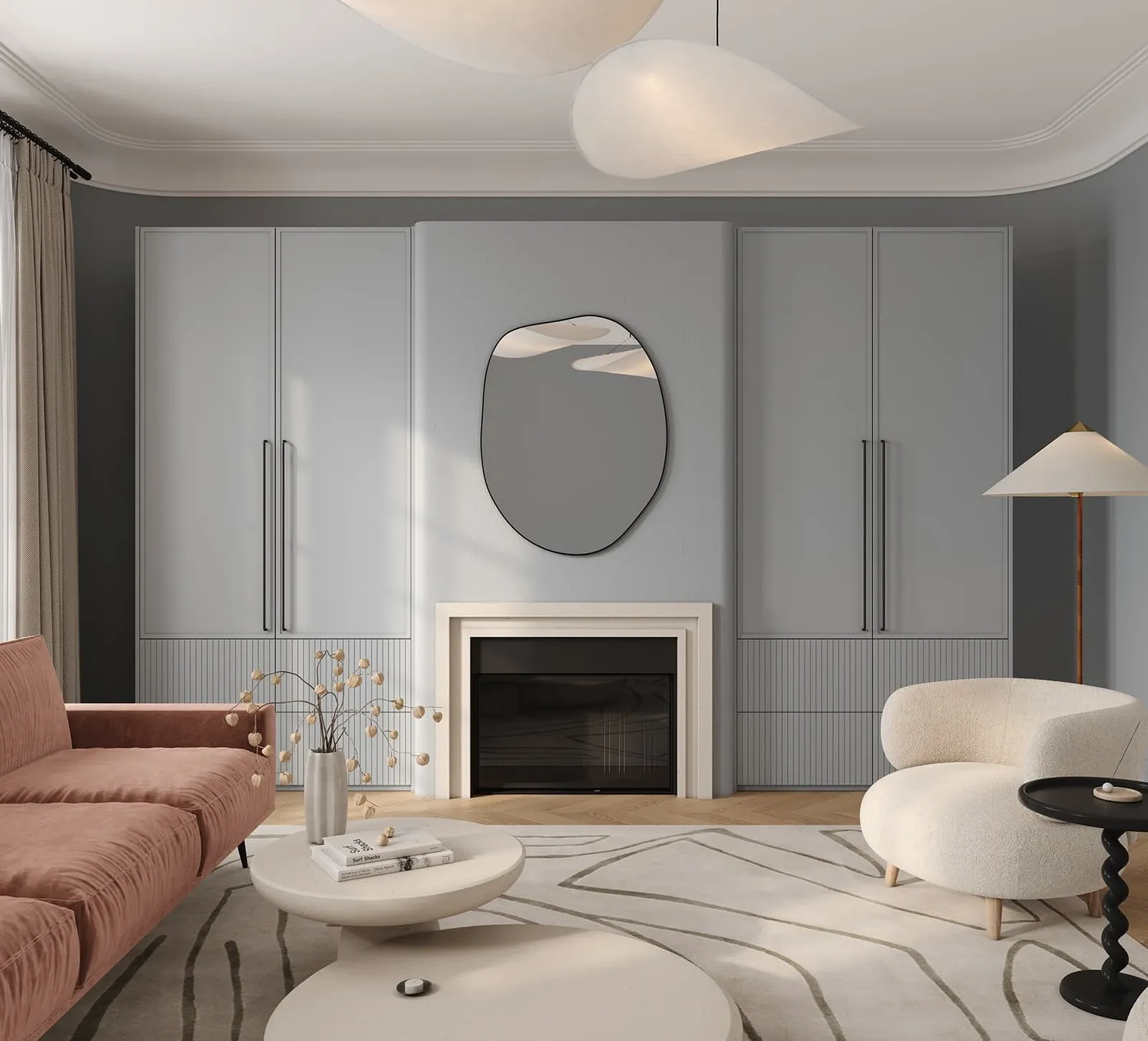 КАРКАС, ПОЛКИ, ВНУТРЕННИЕ ВЫДВИЖНЫЕ ЯЩИКИ, ЗАДНЯЯ СТЕНКА ЛДСП, цвет Белый Премиум / Белый ФАСАДЫ Рокси (крашеная МДФ) / Аврора (крашеная МДФ), цвет NCS S 2005-B Матовый