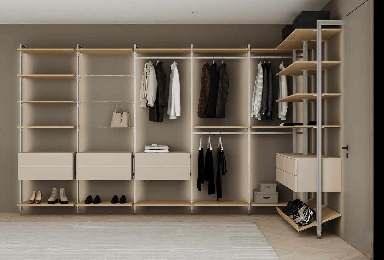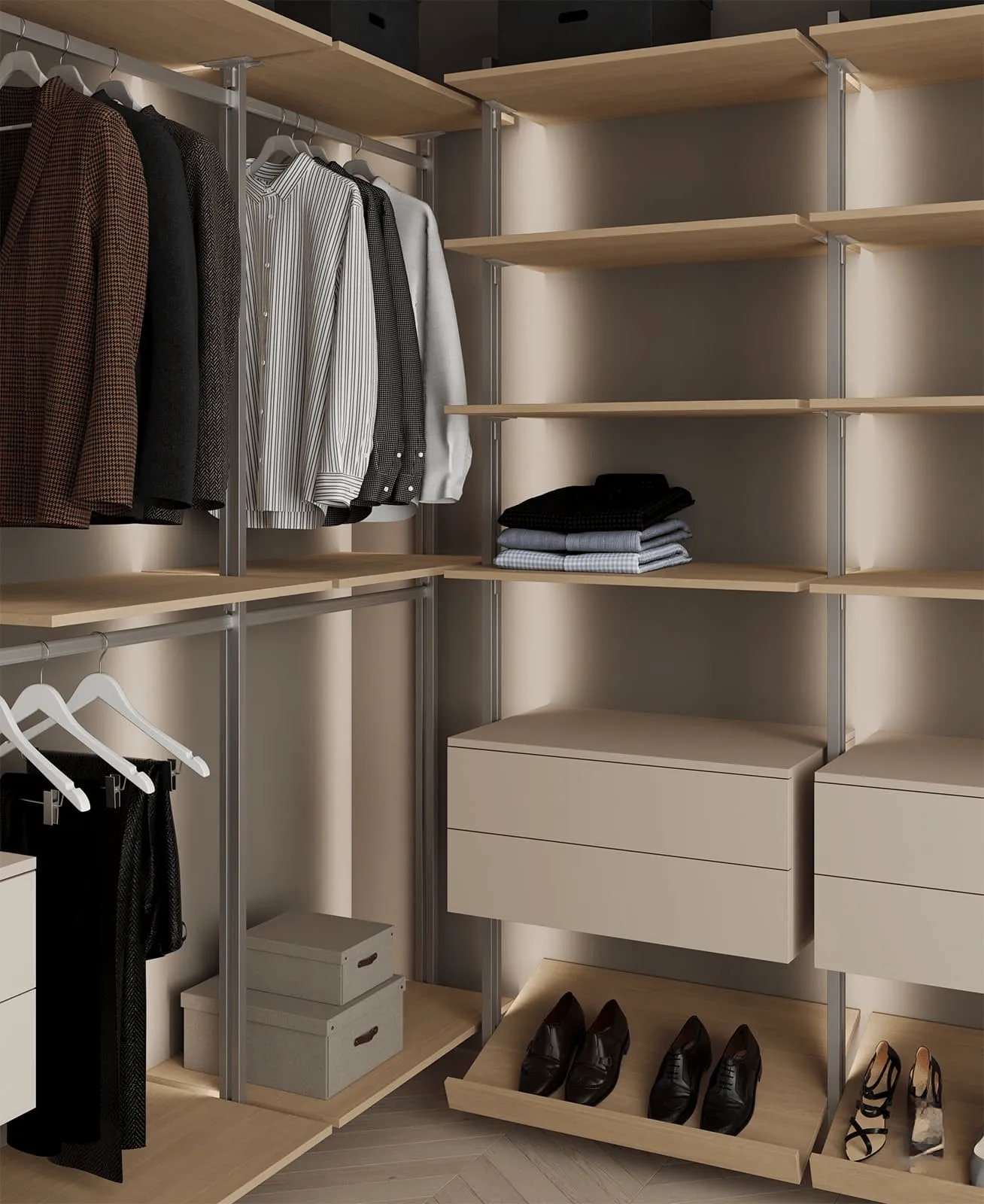 Навесные элементы: ЛМДФ (толщина 18 мм), декор Бежевый Супрамат / шпон дуба (толщина 19 мм), цвет #189 (масловоск Белый) / стекло прозрачное (толщина 6 мм)
