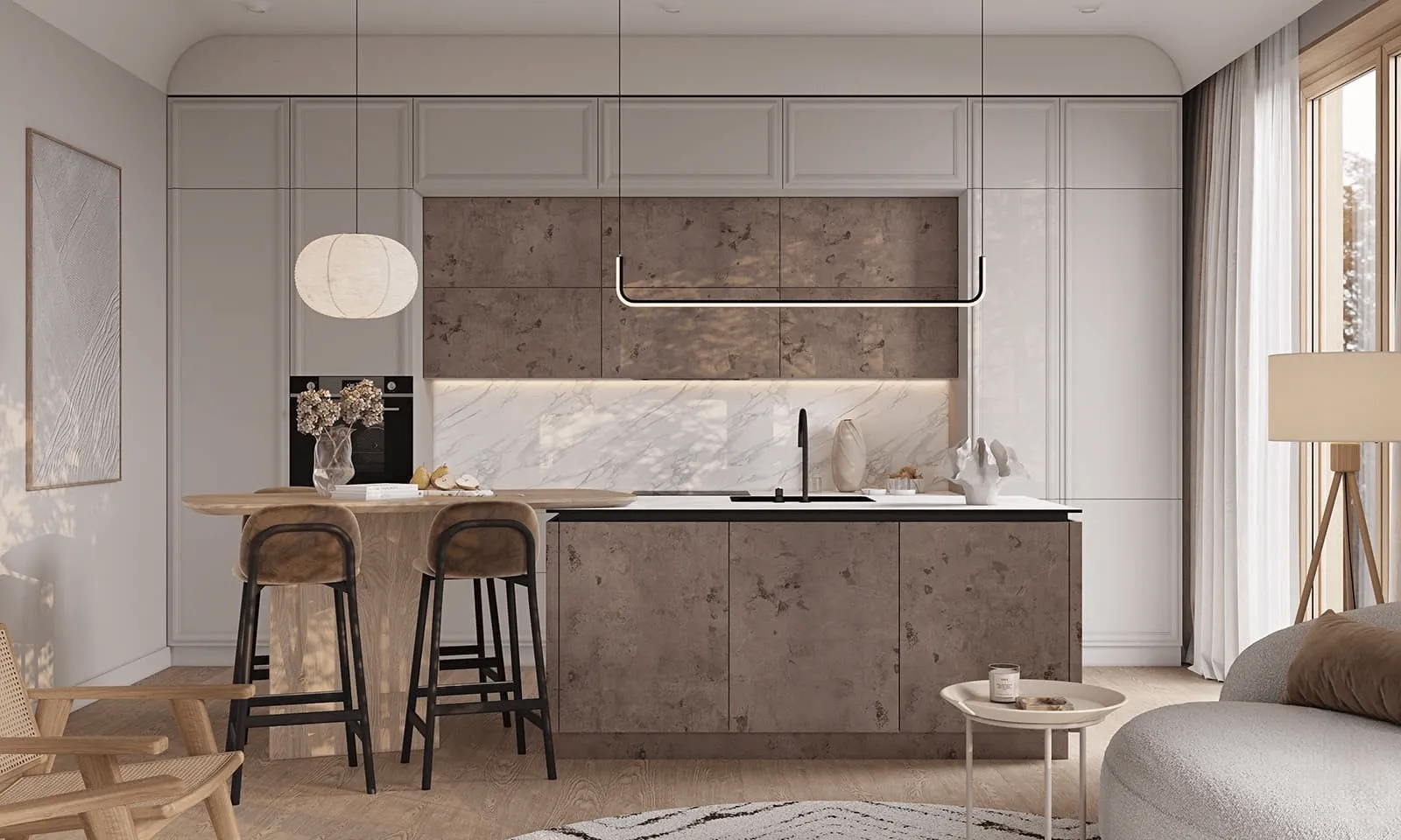 Фасады: Т648 Крашеная МДФ / массив ольхи, цвет 156; ЛДСП Синкрон, декор Титанио.