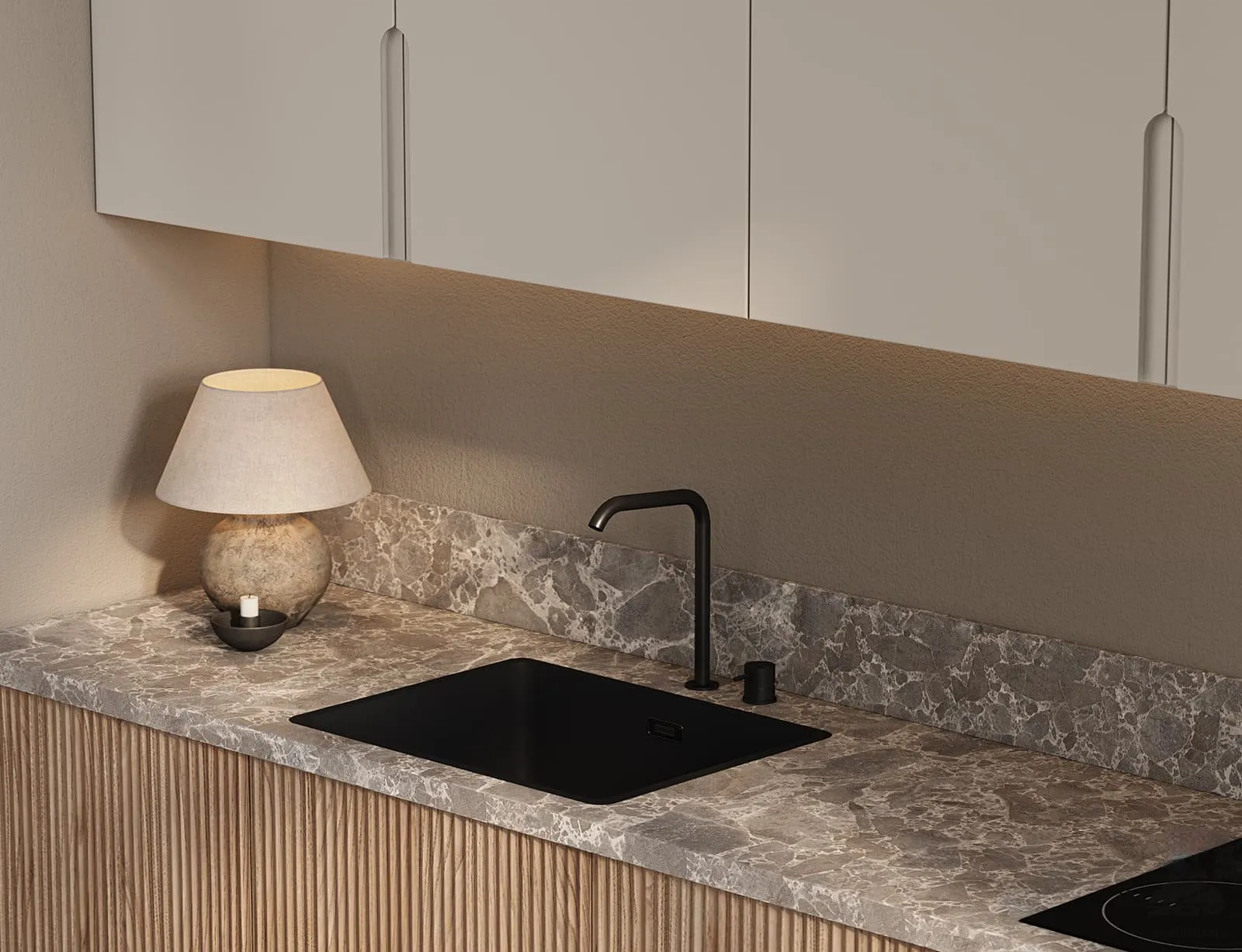 Столешница: Пластик HPL, 38 мм, декор Гранит Рокфорд.Механизмы открывания / Ручки: Push to open / фрезерованная КВ-3.