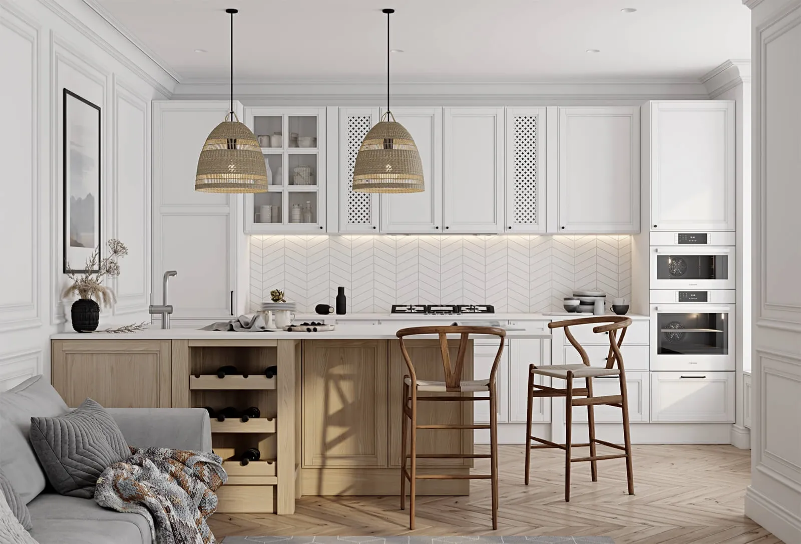 Декоративные элементы: Шкаф напольный для бутылок МШЛБ60(870)_45прав, шкаф напольный угловой с открытыми полками МШЛУ45 9870)_60прав, шкаф напольный со стеклянной полкой МШЛ45(870) полка стекло_60, панель декоративная МБН-1(870)-60 Цоколь: Прямой (ДСП, оклеенная шпоном ясеня, толщина шпона 0,6 мм) высота 96 мм