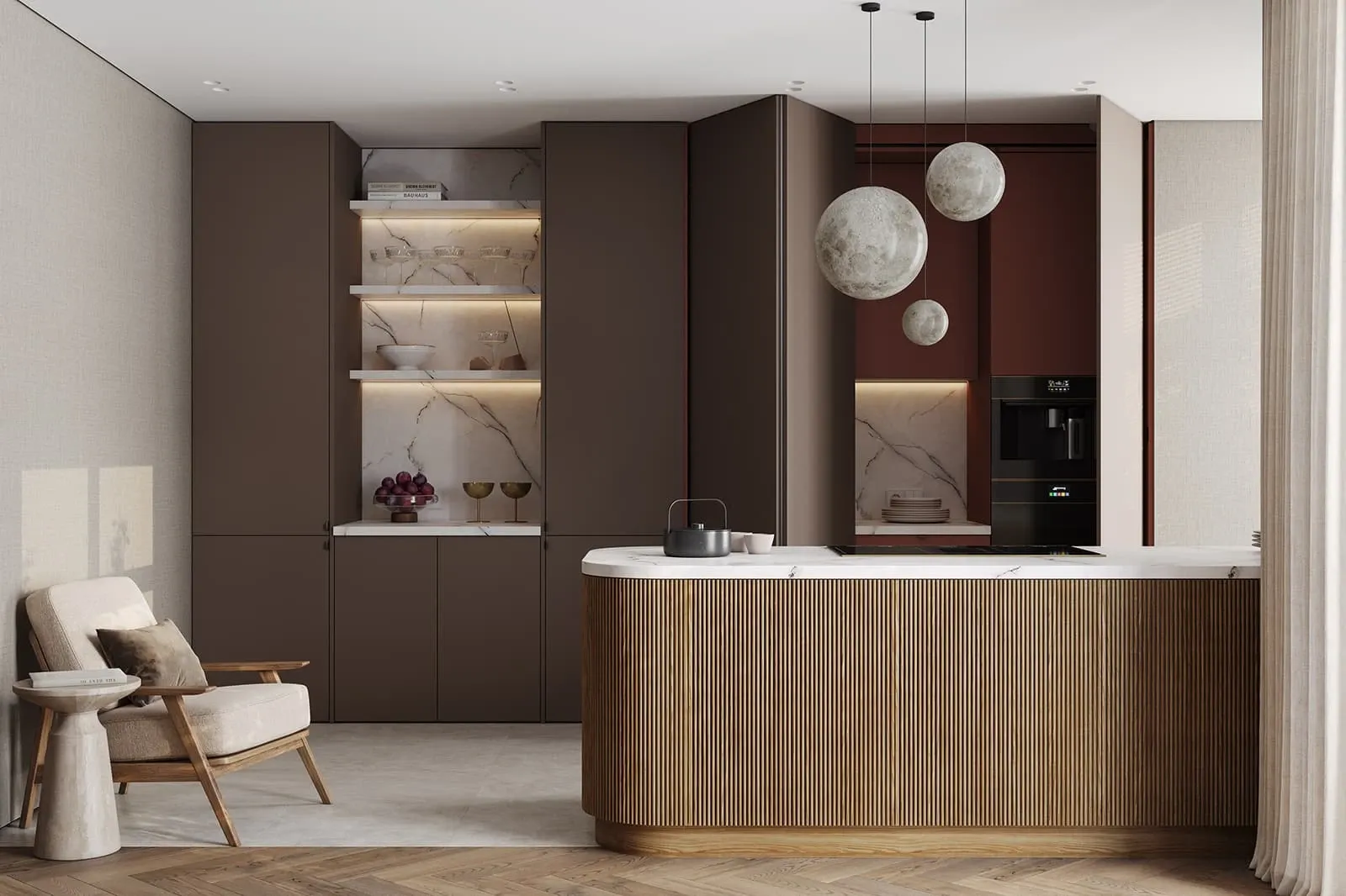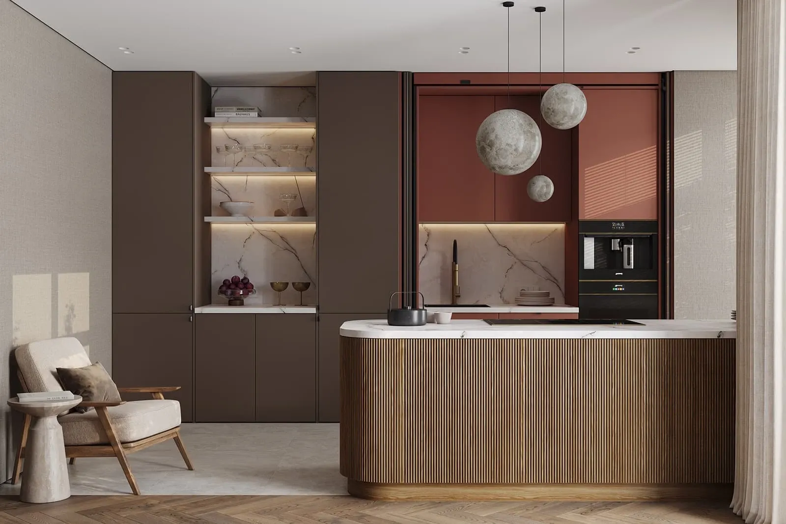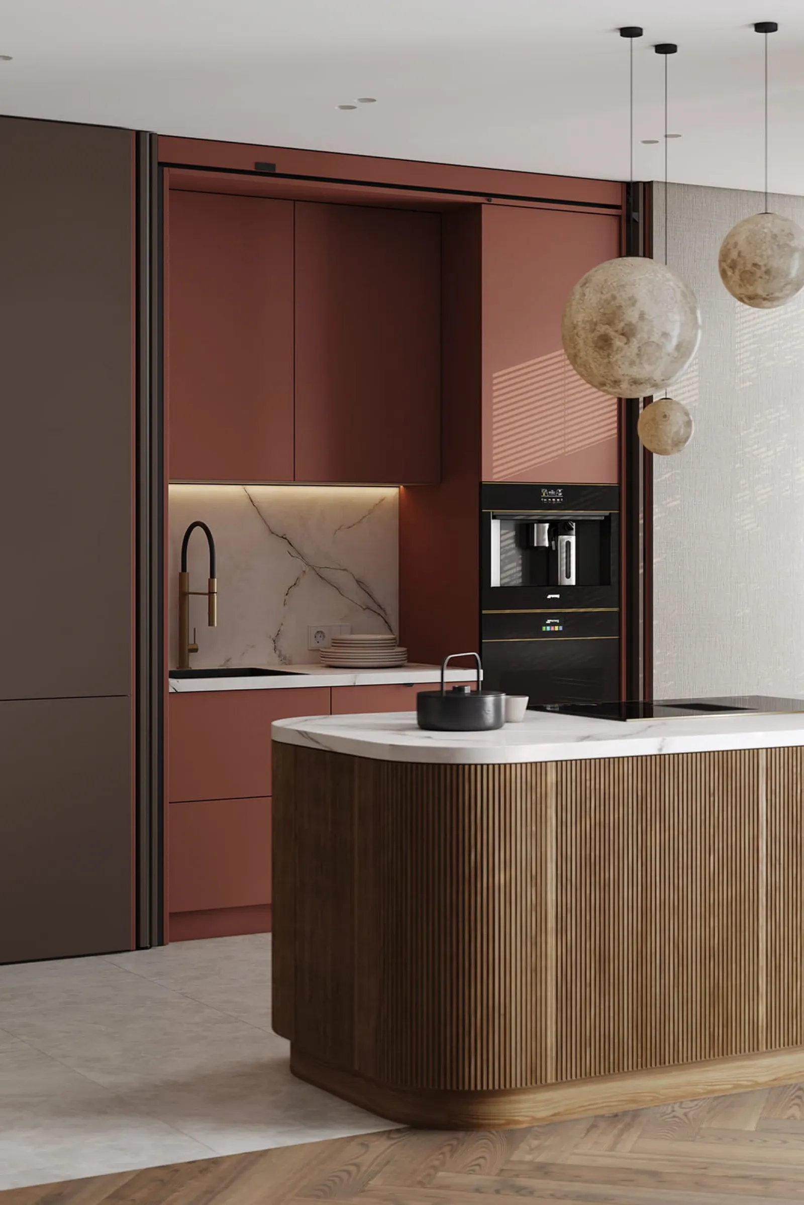 Фасады: ЛМДФ PRIME, цвет Камень Фундо / Терракота Тосканы; T430 Шпон дуба, цвет #111