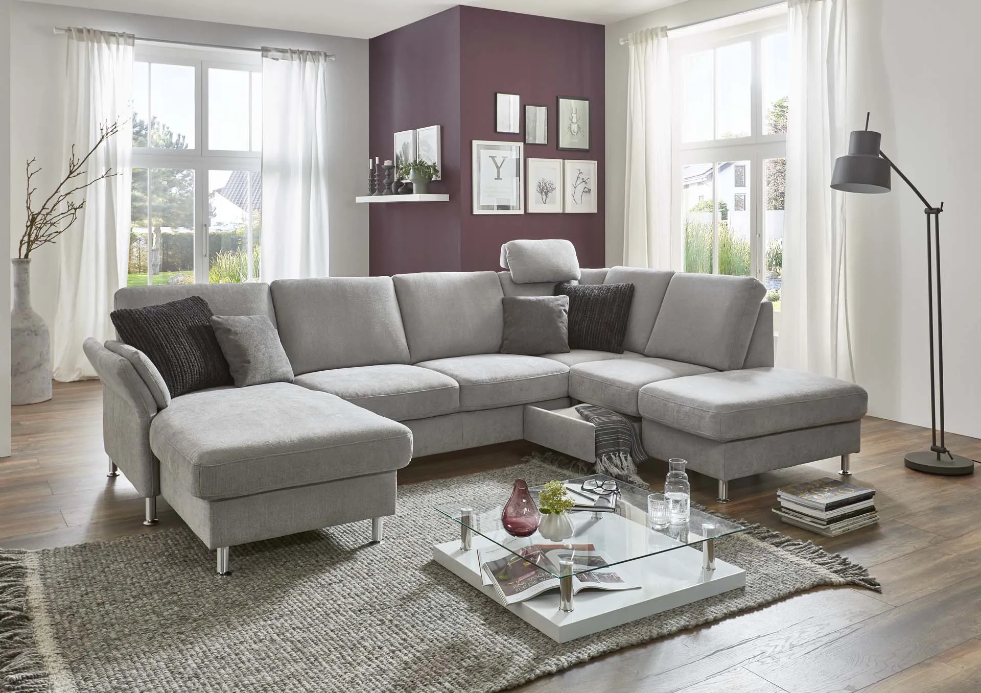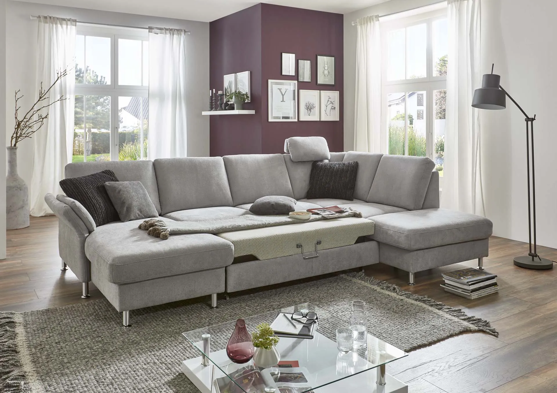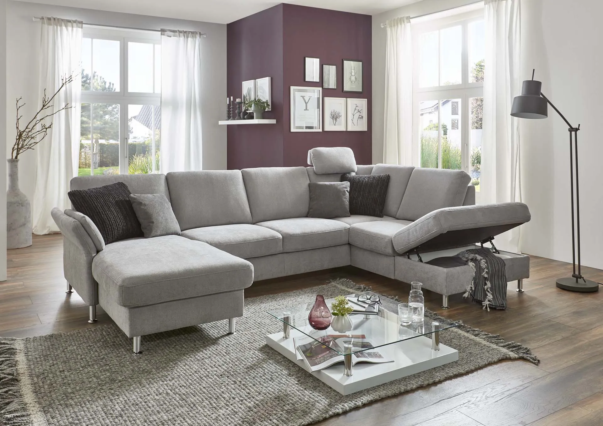 Ручной механизм регулировки подлокотника + канапе + увеличенный двухместный элемент, трансформируемый в спальное место + одинарный комбинированный элемент с выдвижным ящиком для хранения и с ручным механизмом подъема крайней части для доступа к ящику + подголовник премиум.