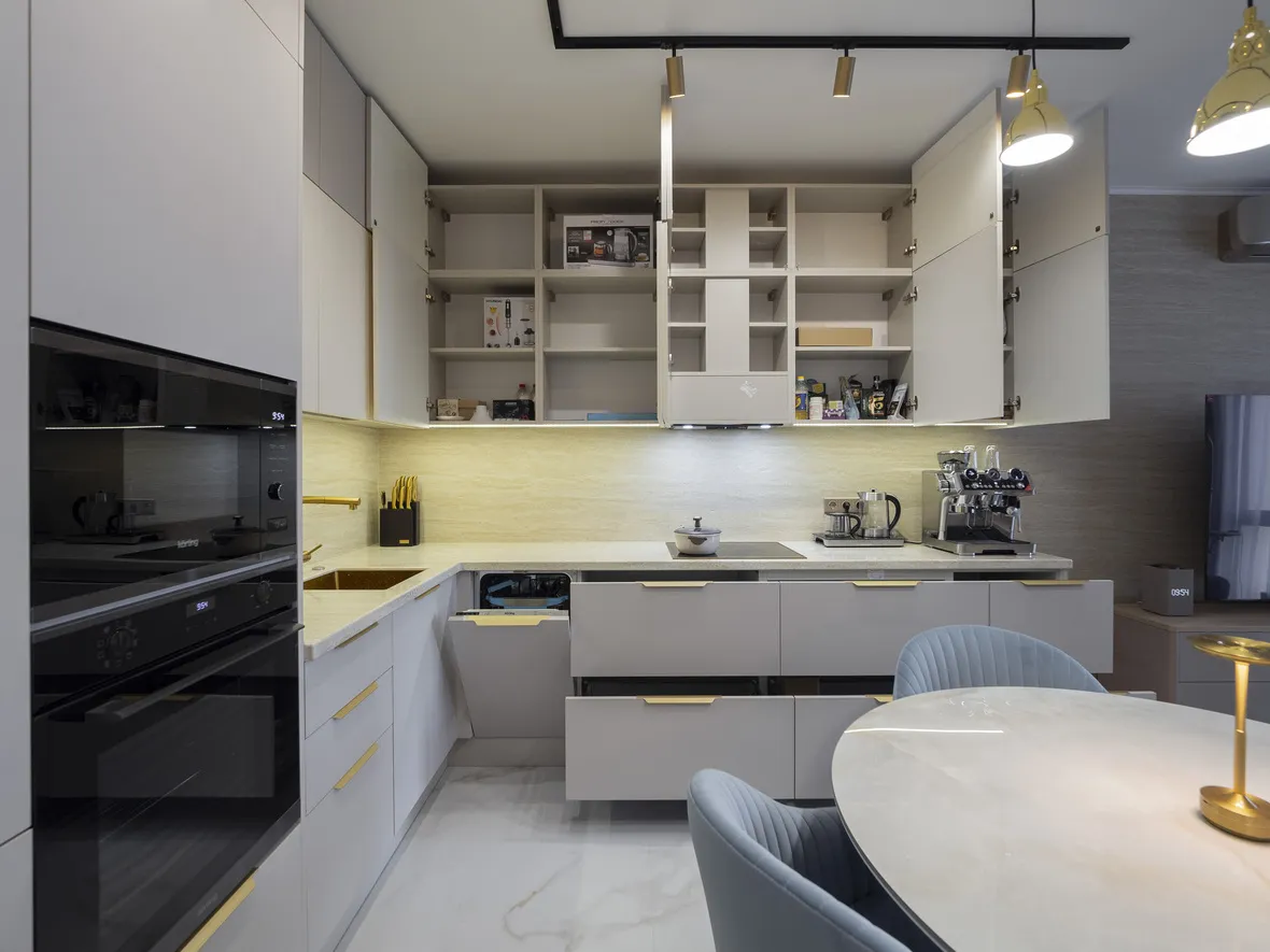 Техника: мойка и смеситель - EMAR, измельчитель - BONE CRUSHER, встроенный духовой шкаф, встроенная электрическая варочная панель, встроенная СВЧ, встроенная вытяжка, встроенная ПММ, встроенный холодильник - KORTING